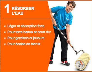 Grâce à notre produit unique, vous pouvez profiter de vos heures de sport sur le court de tennis malgré les averses et les flaques d'eau. Notre produit est conçu pour absorber efficacement l'eau sans que d'autres matériaux n'adhèrent à l'éponge. Cette propriété fait du rouleau éponge le produit idéal pour une utilisation sur les courts en terre battue souvent préparés avec de la poudre de brique. Mais le rouleau éponge absorbant peut également être utilisé de manière optimale sur les courts de tennis en quartz ou en dur. Le matériau de l'éponge est constitué de granulés spéciaux de haute qualité, qui permettent d'absorber et de retenir de grandes quantités d'eau sur le court de tennis. L'eau absorbée peut être facilement extraite de l'éponge à tout moment par pressage mécanique. L'eau s'écoule alors verticalement et vos mains restent propres et sèches. Grâce à la forte tension interne du matériau, l'éponge reprend toujours sa forme cylindrique d'origine, même après avoir été pressée plusieurs fois. La petite taille de l'éponge (diamètre : 23 cm, largeur : 50 cm) permet de l'utiliser même sur les surfaces les plus petites. Les petites flaques d'eau sur votre court de tennis, comme celles entre le banc et les poteaux du filet, peuvent ainsi être facilement atteintes et séchées. De plus, le poids total du produit est limité à 4,9 kg. Ce produit se distingue ainsi comme le rouleau éponge le plus maniable du marché. Notre produit suisse innovant est protégé par un brevet. Le rouleau éponge pour courts de tennis est entièrement fabriqué en Suisse et peut donc porter le label Swiss Made.